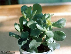 Листья плоские, овальные, со скругленным, слегка волнистым концом, шероховатые, желто-зеленые, 3-4 см длиной, 1-1,5 см шириной. Побеги прямостоячие, сочные, зеленые, до 10 см высотой. Цветоносы до 50 см, восходящие, тонкие. Цветки очередные, мелкие, белые.