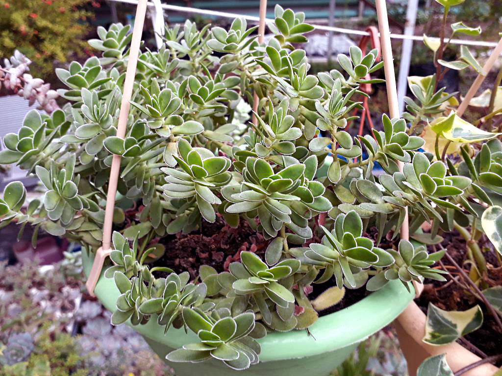 Листья слегка бархатистые, зеленые, 3-4 см в длину, обратнокаплевидной формы. Растение формирует группы коротких восходящих побегов.