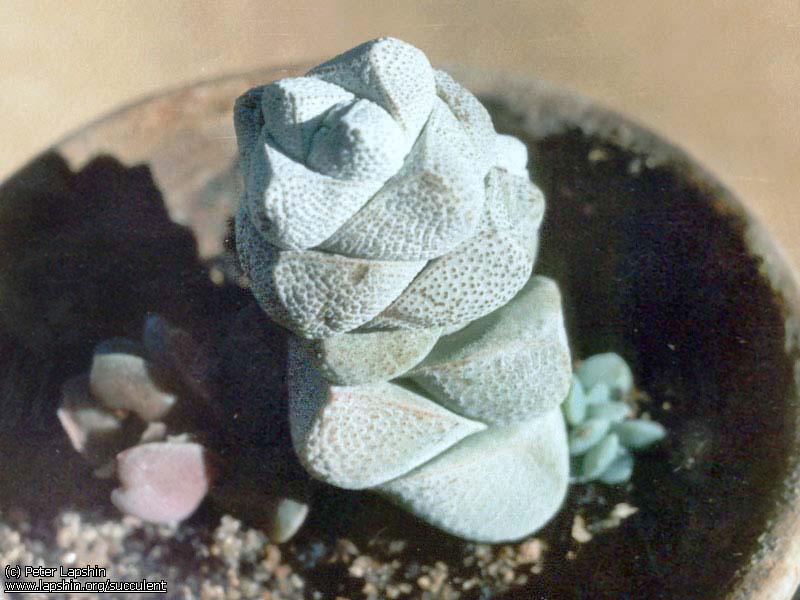 Побеги короткие, полегающие, медленнорастущие, 1 см в диаметре, покрыты серо-серебристыми, очень сочными листьями. Цветет желтыми цветками размером около 1 мм, располагающимися на рыхлом цветоносе, зимой.