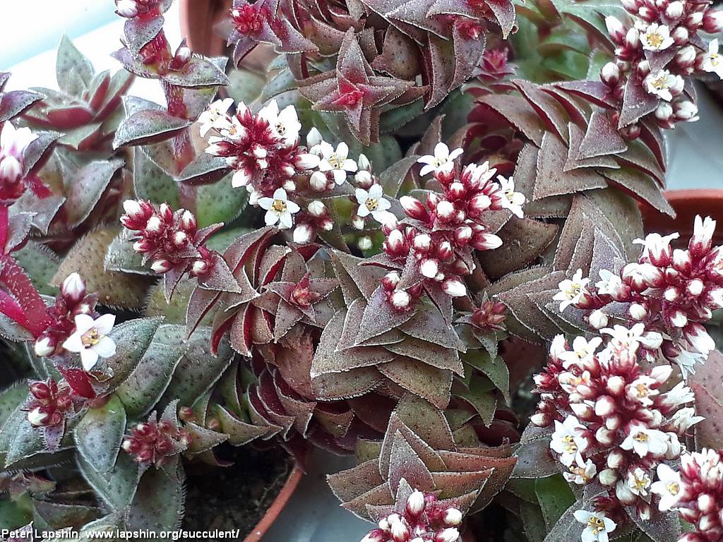 Зацветающие розетки почти целиком растягиваются в высокий цветоносный побег, обычно 5-10 см в зависимости от формы. Цветки пазушные между листьями, белые, розовые, кремовые. Время цветения: осень.
