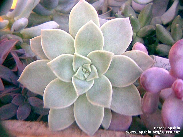 Миниатюрное растение с сочными, серебристыми, ромбовидными листьями 1-2 см длиной на рыхлооблиственных полегающих стеблях 5-15 см длиной. Очень похоже внешне на Graptopetalum rosanevadoense.