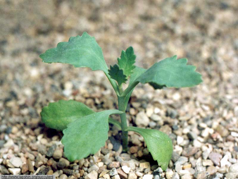 Побеги прямостоячие, листья серо-зеленые, тонкие, малосуккулентн, округлые, до 5-7 см в диаметре, с городчатым краем.