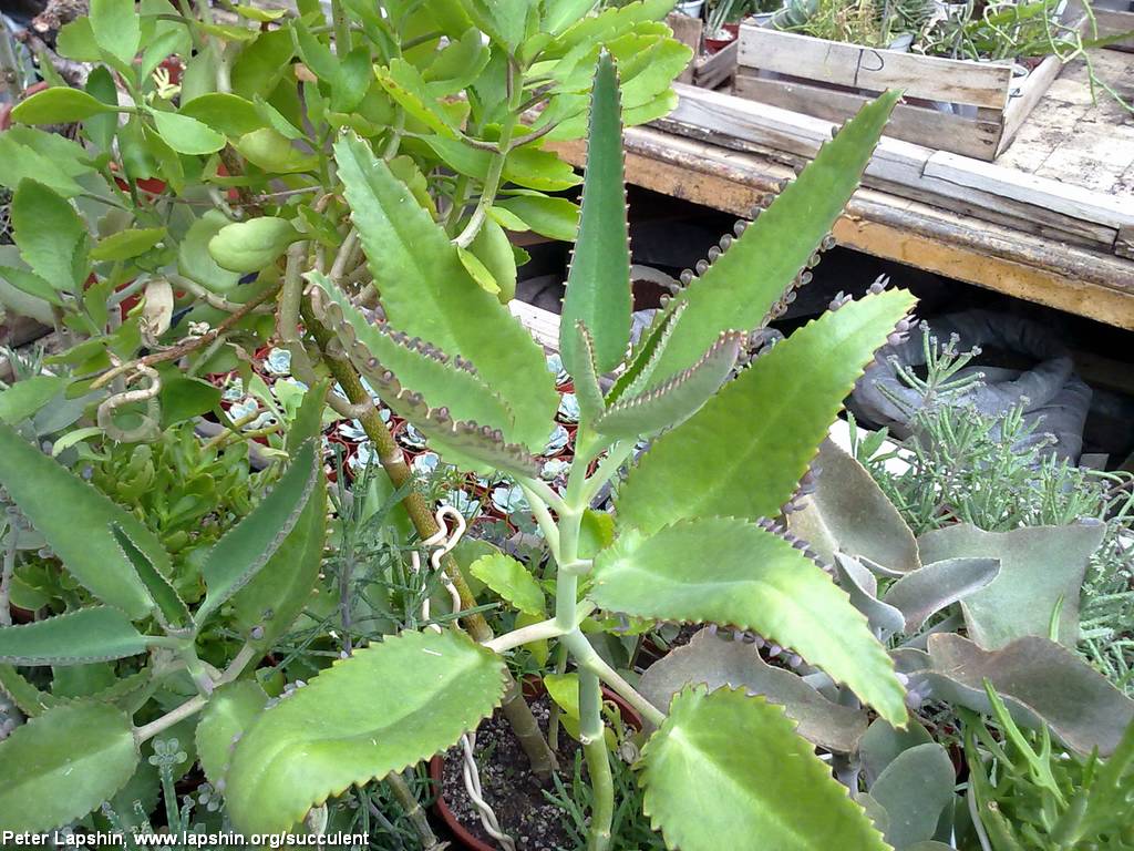Сильнорослое растение до 1 метра высотой с треугольными зелеными сверху и серебристыми снизу листьями до 10-15 см длиной, покрытыми детками по всему краю.