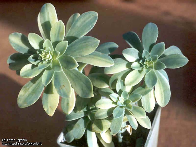 Появление этой вариегаты случилось в собственной коллекции в начале 2000х годов. Побеги 10-30 см длиной, полегающие, ампельные. Листья голубовато-зеленые, собраны в плотные розетки 3-5 см в диаметре на концах побегов. Вариегатная форма имеет продольные, несимметричные, желтоватые полосы на листьях. Соотношение желтого и зеленого сильно варьирует от побега к побегу. Вид легко и довольно обильно цветет зимой желтыми цветками.