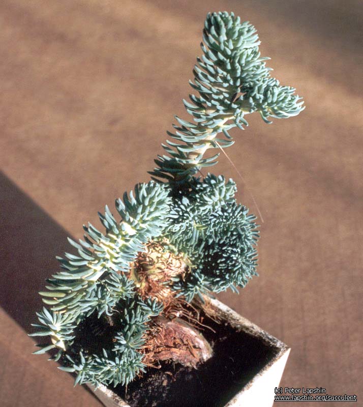 Стелющееся, почвопокровное растение. Листья игловидные, голубые, 1,5-2 см длиной. Может зимовать в открытом грунте. Кристатная форма отличается веерообразными побегами.