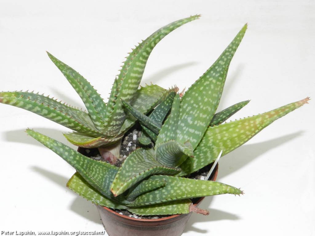 Розетки сидячие, диаметром 30-40 см. Листья серо-зеленые, вытянуто-треугольные, покрыты светлым крапом, по краю пильчатые. Цветоносы 20-40 см высотой, совцетие головчатое, цветки трубчатые, желтые.