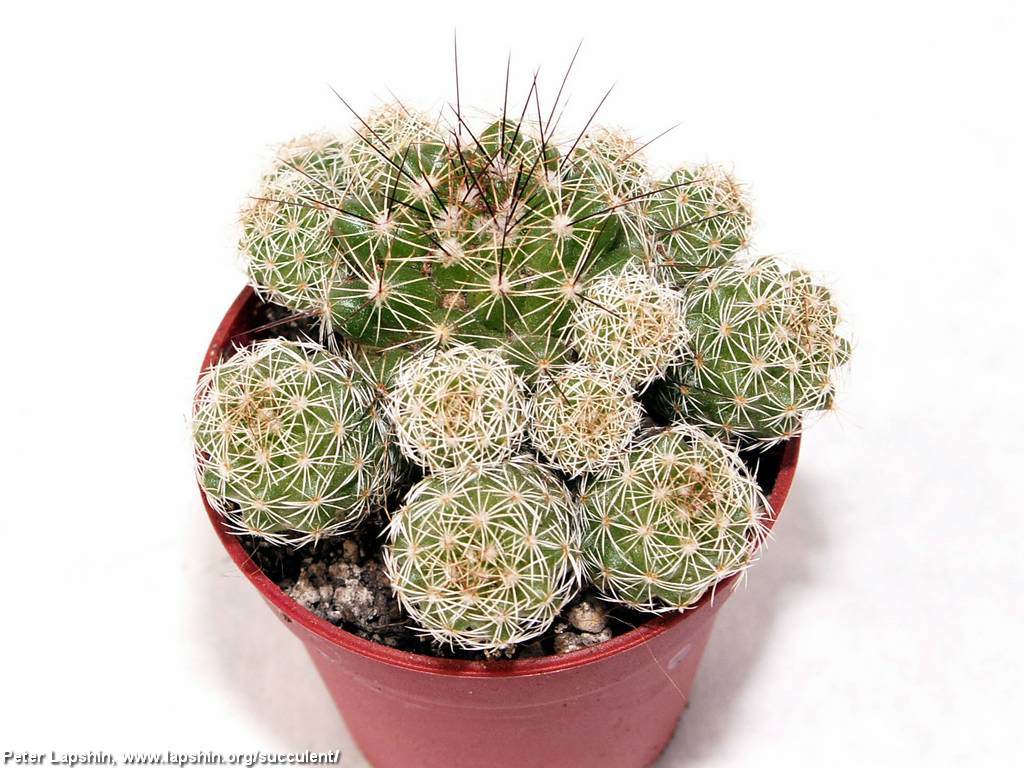 Куртинообразующий, многоголовый кактус с белыми, прилегающими колючками. Диаметр побегов 2-3 см, они быстро покрываются шарообразными детками около 1 см в диаметре.