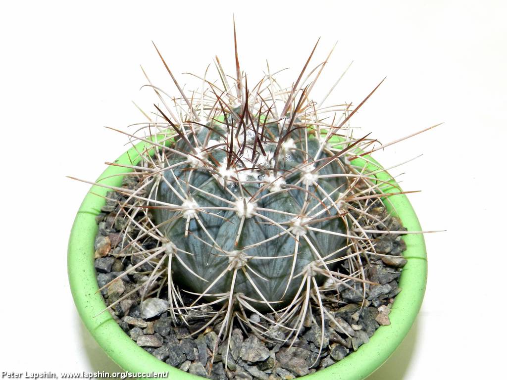 Стебли шаровидные или короткоцилиндрические, до 20 см в диаметре, интенсивно сизого цвета (хотя есть формы этого вида с обычными серо-зелеными телами.