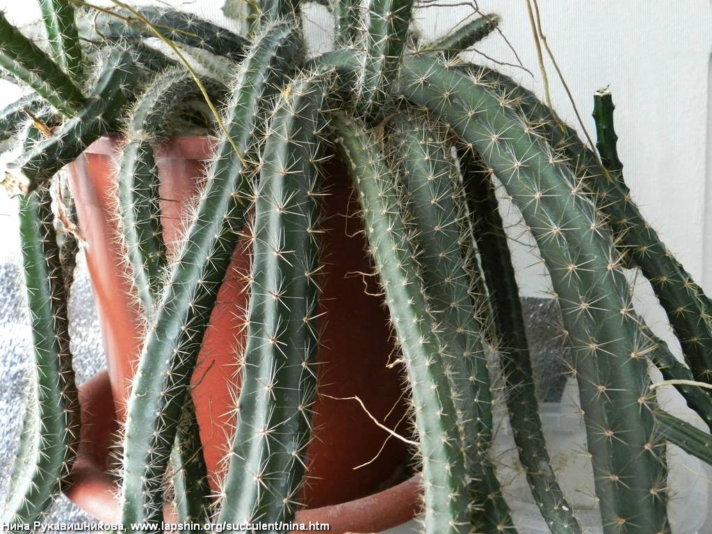 Родина - Никарагуа и юго-восток Мексики. Занимает преимущественно сезонно-сухие тропические биомы, часто ведет эпифитный образ жизни, если имеет возможность взобраться на влажную опору, к которой прикрепляется воздушными корнями. Побеги до нескольких метров длиной, свисающие или взбирающиеся, серо-зеленые, 4-5-гранные, 2-3 см в диаметре. Колючки светлые, прочные, прямые, жесткие, длиной до 1 см.