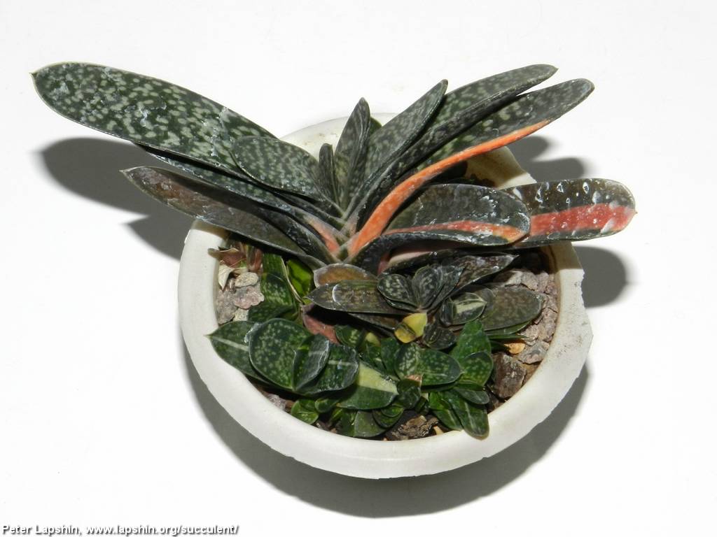 Листья короткие, 2-5 см длиной, жесткие, ремневидные, сочные, толстые, со светлыми мелкими округлыми выпуклыми пятнами, серо-зеленые с несимметричными ярко-желтыми продольными полосами на части листьев. Наличие и количество желтых полос варьирует между боковыми розетками. Часто появляются как простые зеленые, так и полностью желтые розетки.