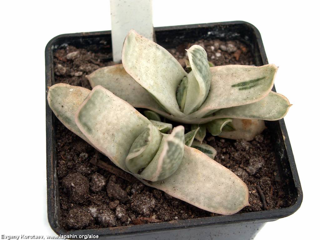 Листья 5-10 см длиной, жесткие, ремневидные, сочные, толстые, со светлыми мелкими округлыми выпуклыми пятнами, темно-зеленые, с несимметричными почти белыми продольными полосами на части листьев. Наличие и количество полос варьирует между боковыми розетками. Часто появляются как простые зеленые, так и полностью белые розетки.