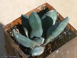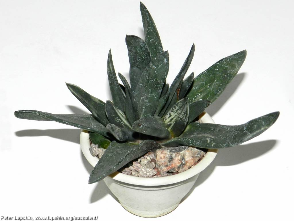 Розетка сидячая, новые сразу закручивающиеся, часто несимметричные, с листьями, появляющимися не последовательно, а одновременно. Листья 10-15 см длиной, жесткие, ремневидные, сочные, толстые, серо-зеленые, светлый крап присутствует только местами на некоторых листьях, большинство из них темные однотонные.