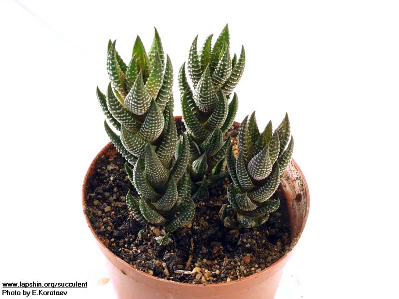 Побеги 3-4 см в диаметре, шишковидные, длиной 20 и более см, равномерно облиственные, полегающие, ветвящиеся от основания. Листья темно-зеленые, матовые, узко-конические, жесткие, прижимающиеся к стеблю и загнутые внутрь, с плоской внутренней стороной листа, снаружи покрыты продольными и поперечными рядами контрастного, мелкого, светлого, выпуклого крапа.
