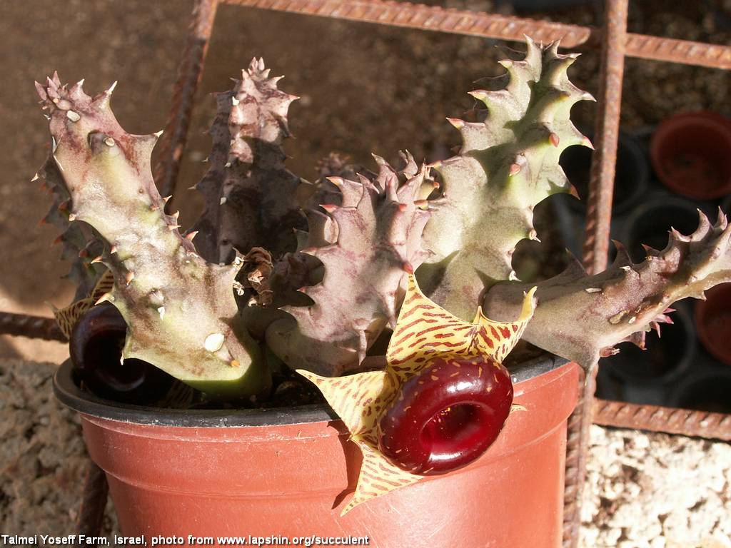 Цветки у основания побегов, почти у земли, звездчатые, 5-членные, плоские, блестящие, с вишневым блестящим внутренним валиком. Диаметр цветка, учитывая удлиненные тонкие концы лепестков, составляет 5 см.