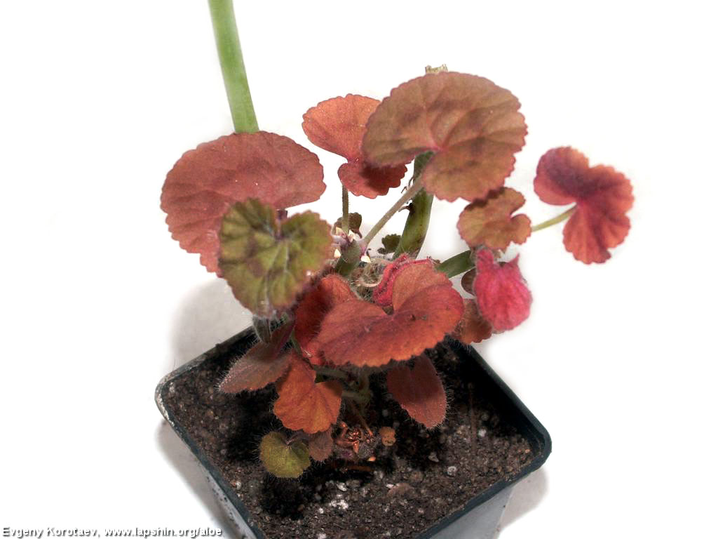 Ветвление начинается от уровня земли. Стебли четырехугольной формы, 4-5 мм в диаметре, голые, зеленые, междоузлия 5-15 см длиной. Листья мелкие, 2-3 см в диаметре, розовеющие на солнце, с контрастным рисунком из поперечных колец. Цветки почти белые с темно-коричневой штриховкой в основании 2 крупных лепестков.