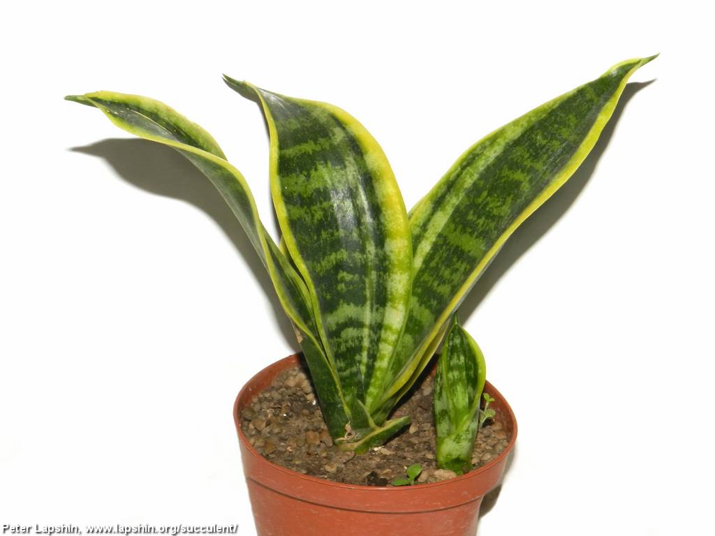 Дикая Sansevieria trifasciata имеет листья до 1,5 метра длиной, что неудобно для декоративного цветоводства. Ее форма с листьями длиной до 60-80 см имеет название S.Laurentii Simplex. Еще более компактные и пестролистные варианты называются S.Laurentii Futura и Superba. А самый минатюрный вариант, с листьями не намного длиннее чем у S.Hahnii, носит название Sansevieria Laurentii compacta. Листья длиной не более 20 см, на конце изогнуты наружу, по краям желтые полосы.