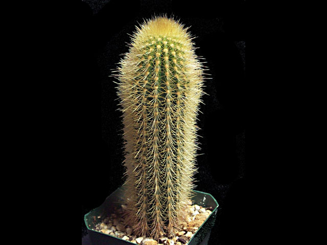 Описание: Диаметр 2-3 см, эпидермис зеленый, ребра 10-15 шт, колючки ярко-желтые, очень густые. Характерные признаки: яркие, густые, желтые, колючки, плотно закрывающие стебель.