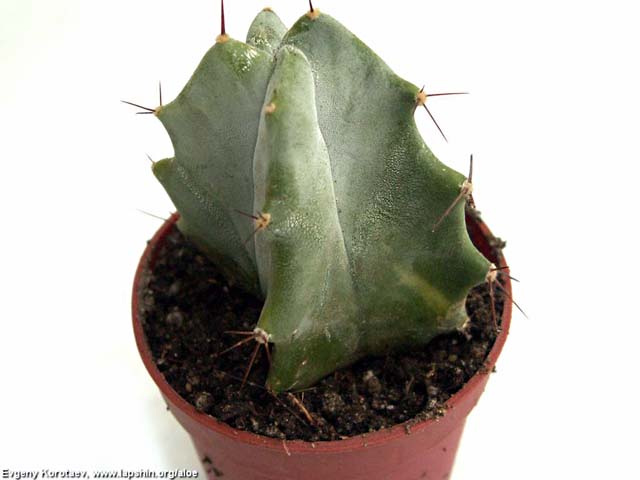 Описание: Диаметр 3-4 см, эпидермис голубовато-сизый, ребра 5-6 шт, колючки коричневые или желтоватые, тонкие, многочисленные. Характерные признаки: сочетание сизо-голубого стебля и желтоватых колючек.