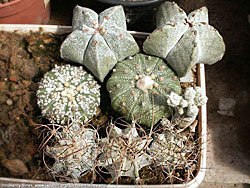 | |  На фото: сзади A myriostigma, средний ряд A. asterias (слева сорт Super Kabuto), нижний ряд - A. capricorne |